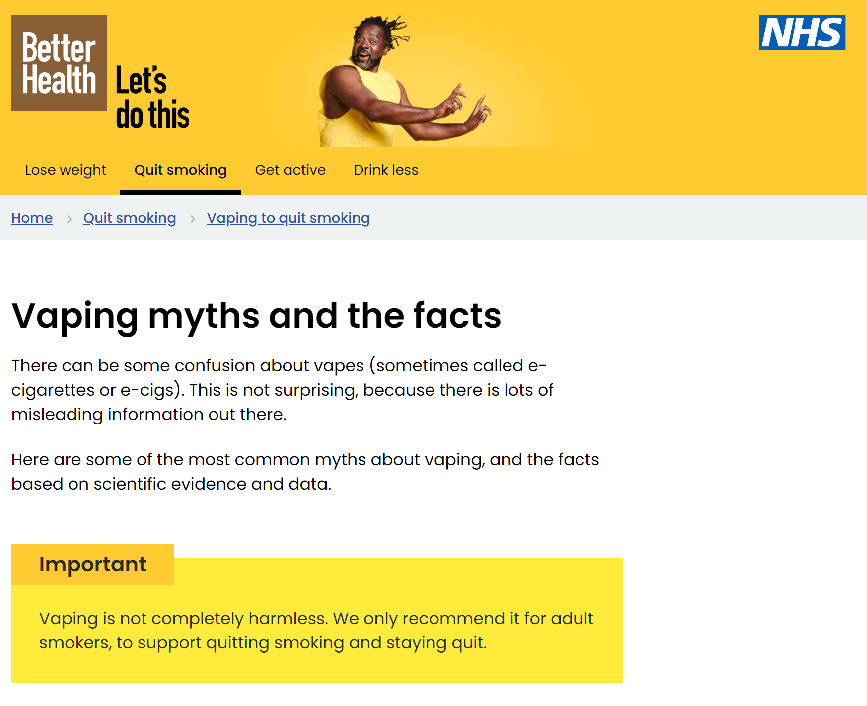 A página começa com a declaração de que:“Pode haver alguma confusão sobre vapes (às vezes chamados de cigarros eletrônicos ou e-cigs). Isto não é surpreendente, porque há muita informação enganosa por aí” e complementa que “vaping não é totalmente inofensivo. Nós o recomendamos apenas para fumantes adultos, para apoiar a cessação do tabagismo e a permanência fora do tabagismo.”